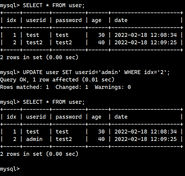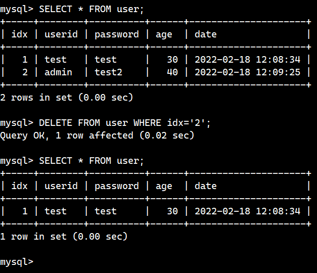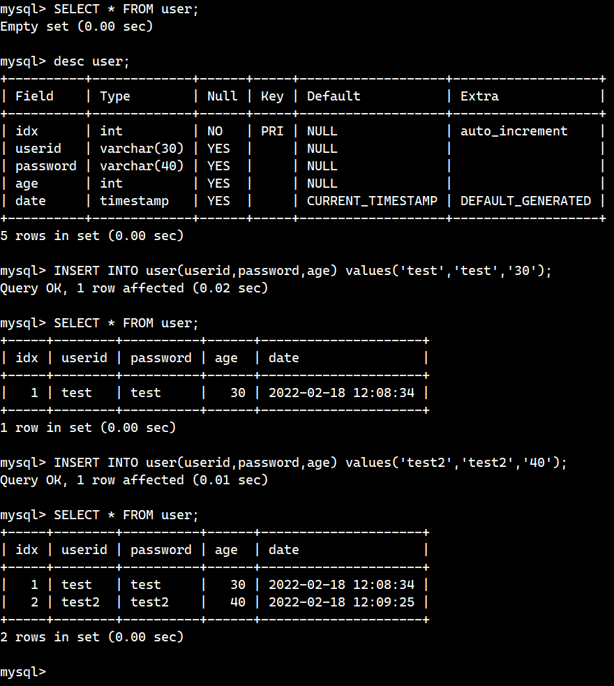 Empty Set인 user 테이블에 INSERT문을 이용해서 레코드를 추가하였다. idx는 디폴트로 AUTO_INCREMENT 값이 들어가고, date는 디폴트로 CURRENT_TIMESTAMP가 들어가기 때문에 INSERT문에는 따로 적지 않았다.