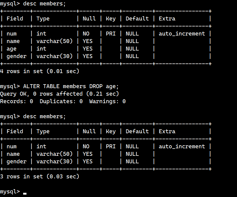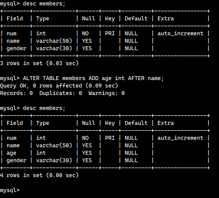 위 그림에서 명령어의 의미는 members라는 테이블에 age라는 이름의 필드를 추가할 것이고, 타입은 int로 지정하여 name이라는 기존의 필드 뒤에 추가하겠다는 것이다.