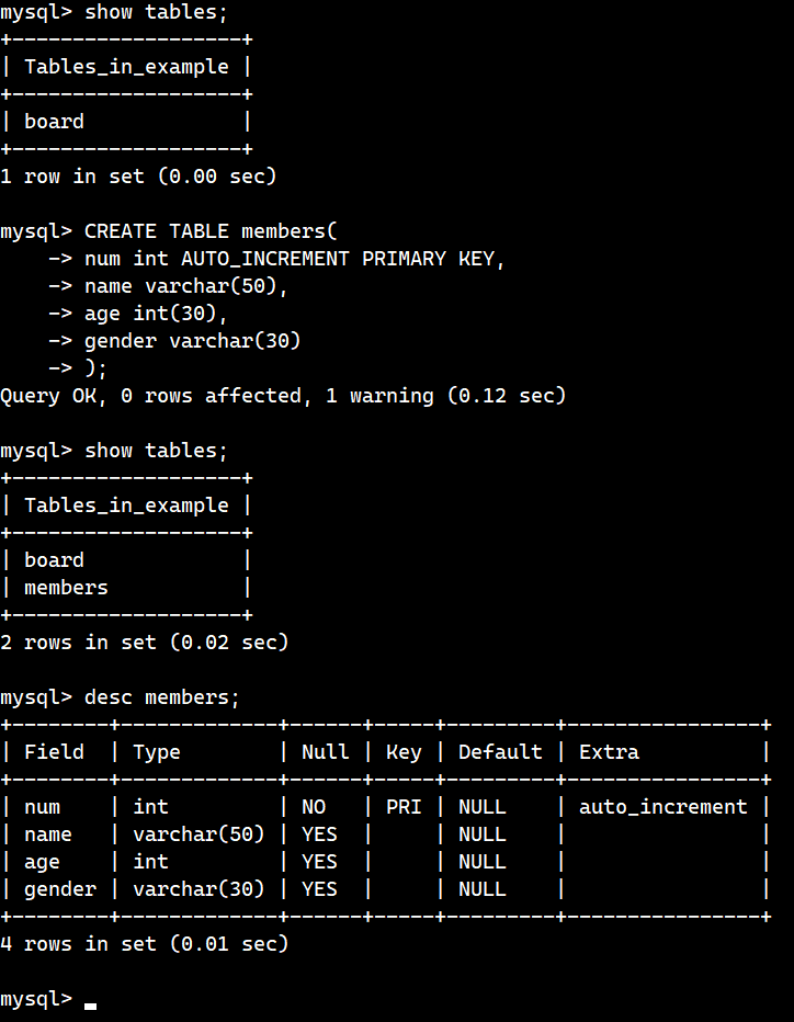 desc members; 라는 명령어를 입력하면 각 필드의 이름과 타입, 디폴트 값 등 정보를 알 수 있다. desc는 describe의 약자이다.