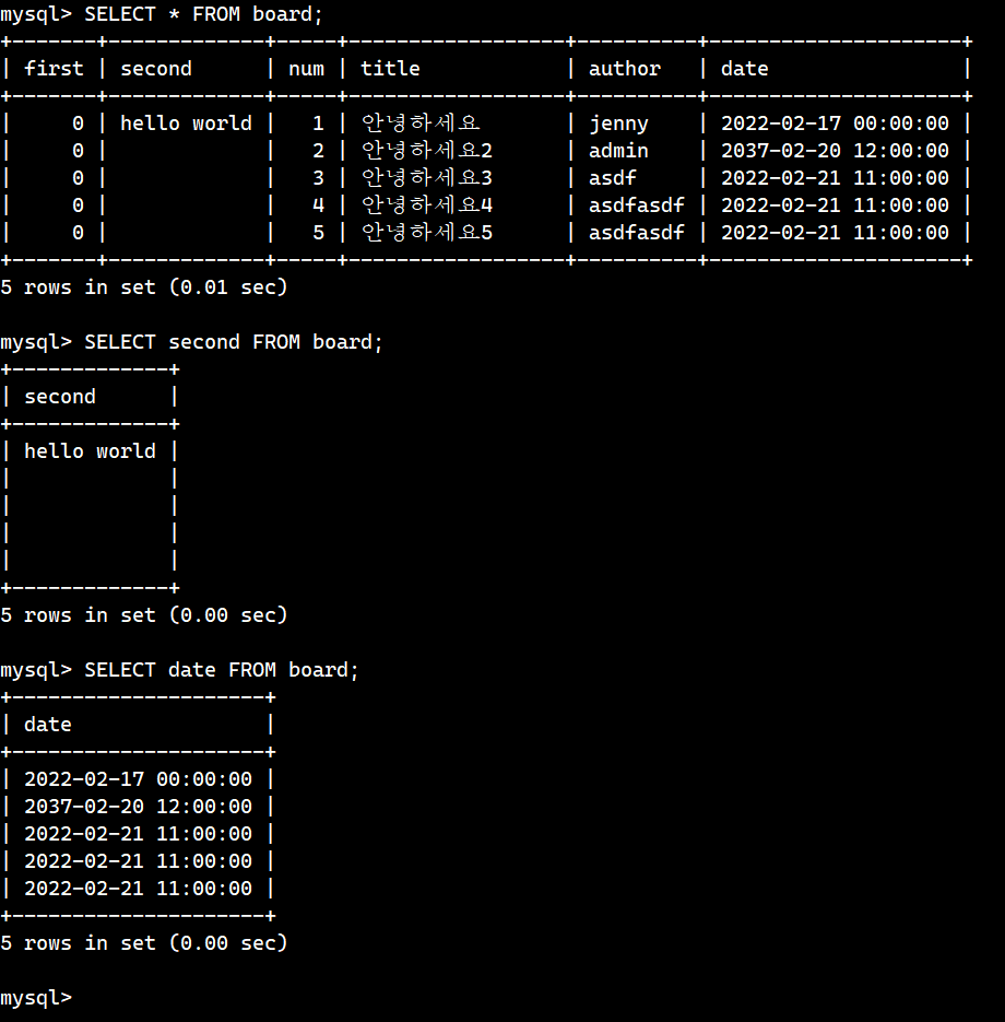 SELECT * FROM [테이블명]; 이라는 명령어는 해당 테이블에 있는 모든 내용을 보겠다는 뜻이다. *는 all의 의미이다.
