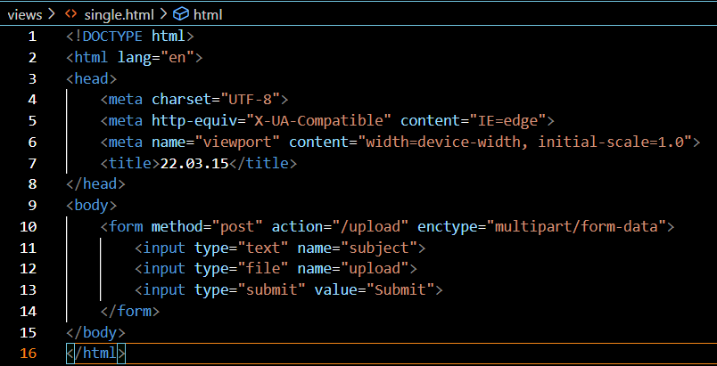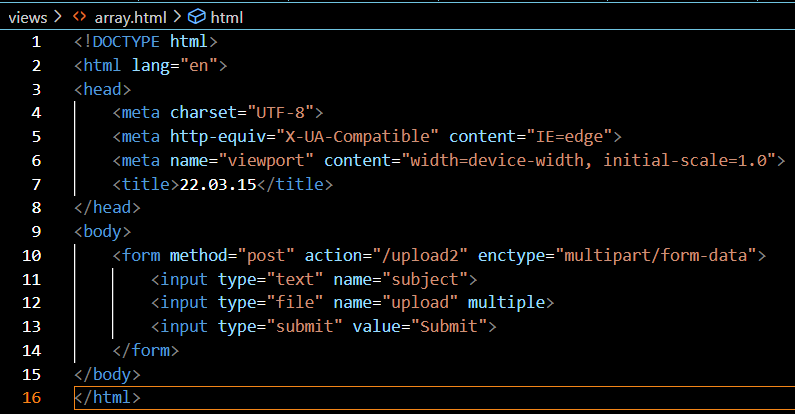 array.html이 single.html과 다른 부분이 있다면, input 태그 안에 multiple이라는 문구가 추가된 것이다. 단어 뜻 그대로, multiple이 없으면 오직 1개의 파일만 업로드 할 수 있고, multiple이 있으면 2개 이상의 파일을 업로드 할 수 있다.
