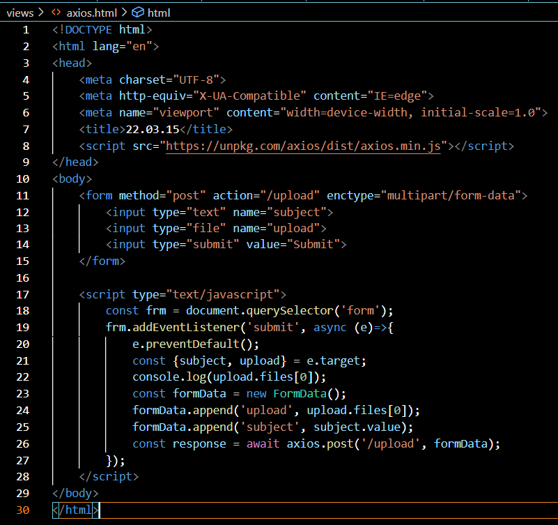 위의 코드는 axios를 이용하여 비동기로 파일을 전송할 때를 기준으로 작성한 html이다.