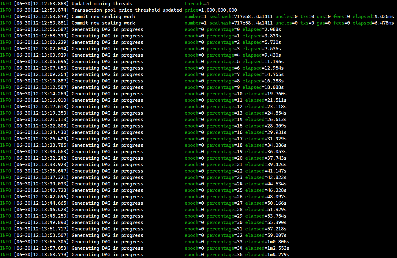 miner.start(1)을 실행하면 null 값이 나오지만, 실제로 채굴이 시작되었다. 숫자 1은 스레드를 1개로 하겠다는 의미이다.