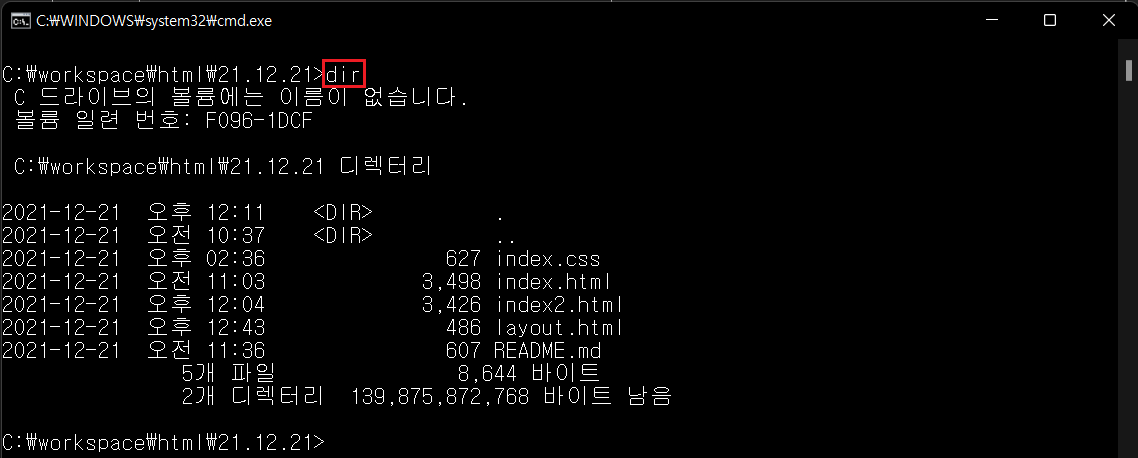 dir은 directory의 약자로, 현재 디렉토리 내부의 파일들을 볼 수 있다. 리눅스의 ls 명령어와 같다.