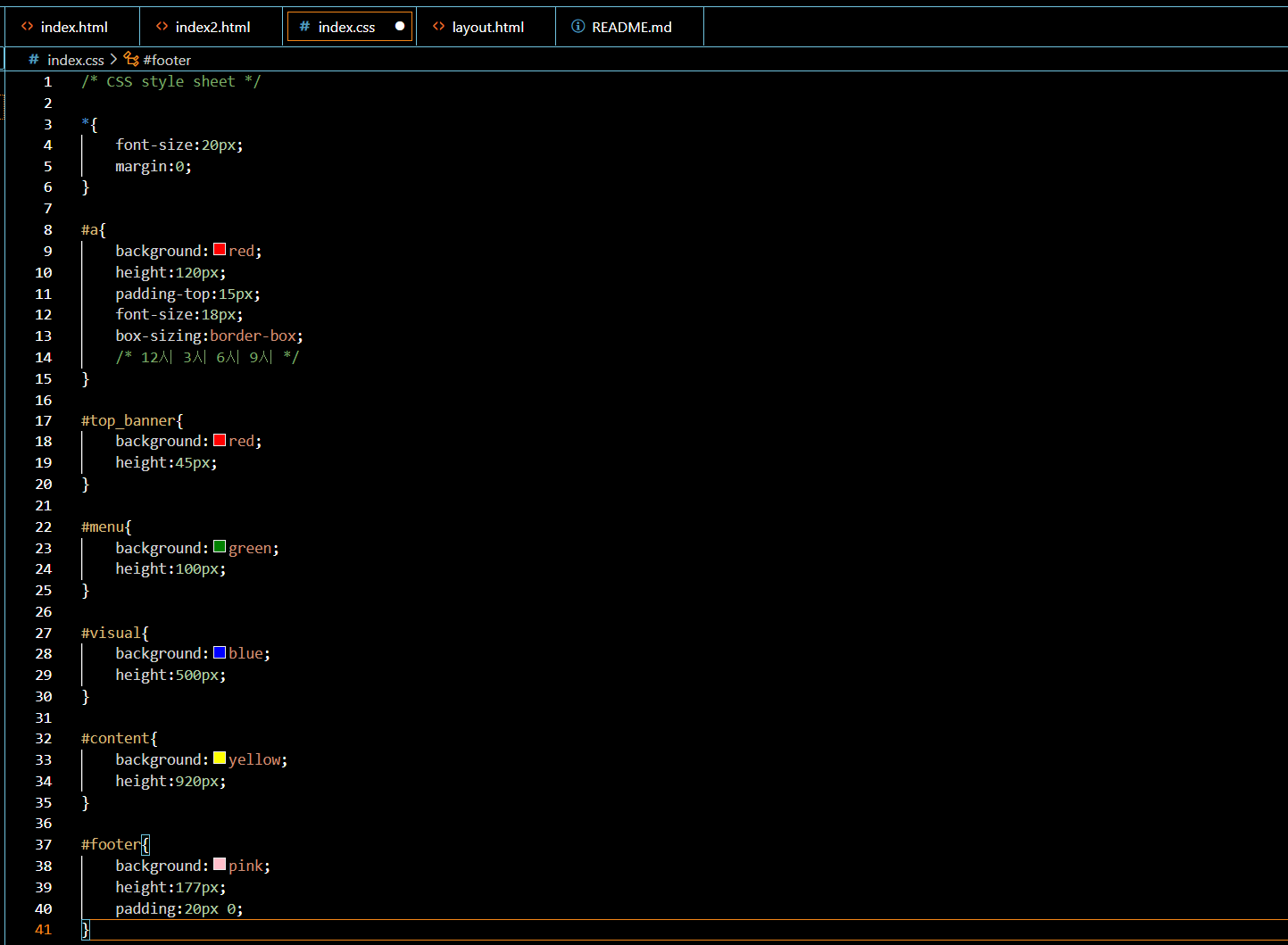 top_banner, menu, visual, content, footer와 같은 단어는 모두 [그림 3]의 id에 해당한다. 이 단어들이 id명과 일치하지 않으면 무용지물이 된다. 그리고 class가 아닌 id를 사용했기 때문에 단어들 앞에는 .이 아닌 #이 붙게 된다.