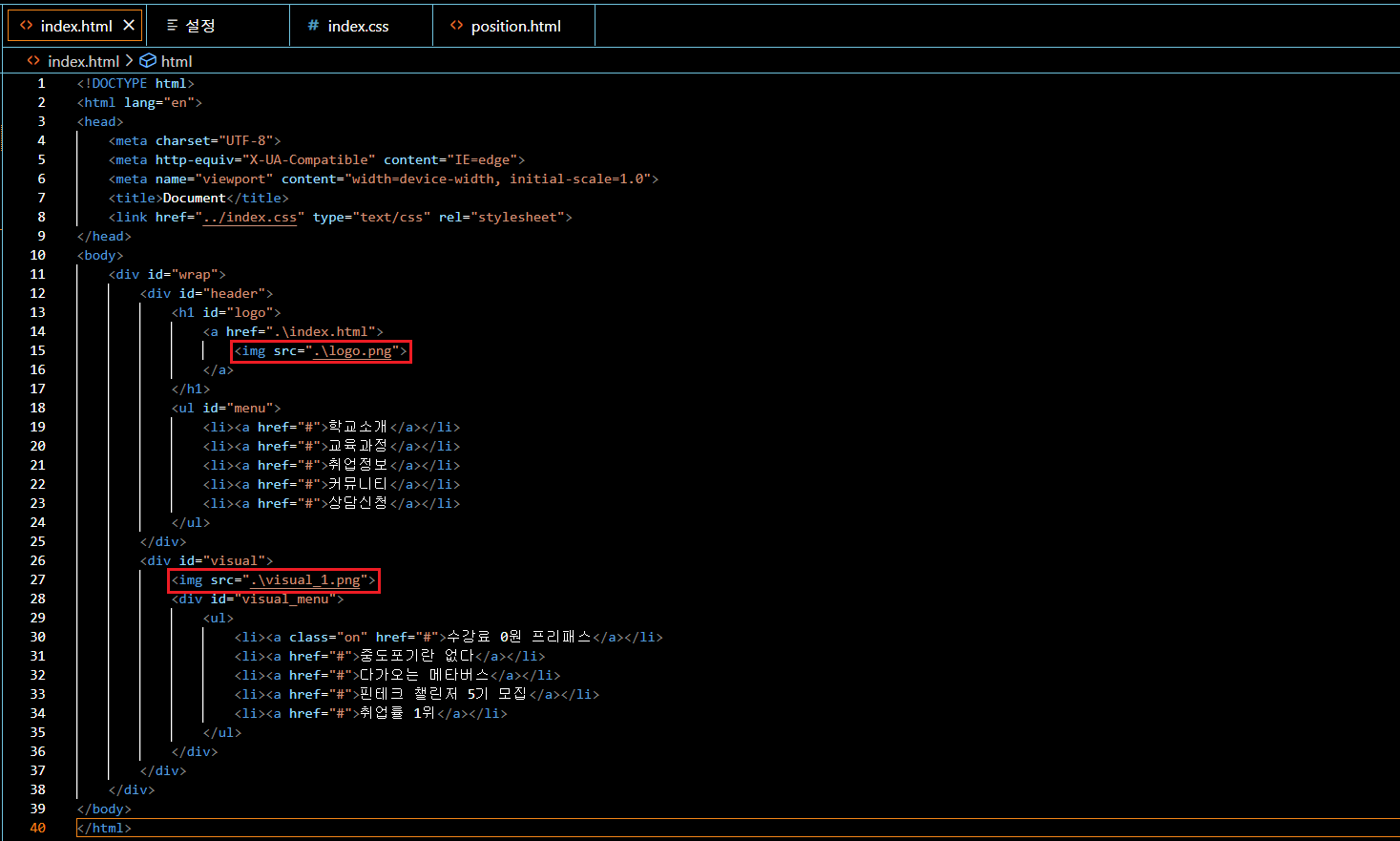 복제하려고 하는 웹페이지는 '경일게임아카데미'의 웹사이트이다. 웹사이트에 사진을 올리려면 먼저 웹사이트의 사진을 내 작업 폴더에 가져와야 한다. 학원 웹사이트의 로고와 배너 사진을 index.html 파일이 속해 있는 21.12.22 폴더에 저장했다. <img> 태그 안에 src=".\logo.png"를 넣어주었는데, 21.12.22 폴더에 속한 logo.png 사진을 불러온다는 의미이다. 배너 사진은 visual_1.png로 같은 폴더에 저장하여 <img> 태그에 붙여주었다.