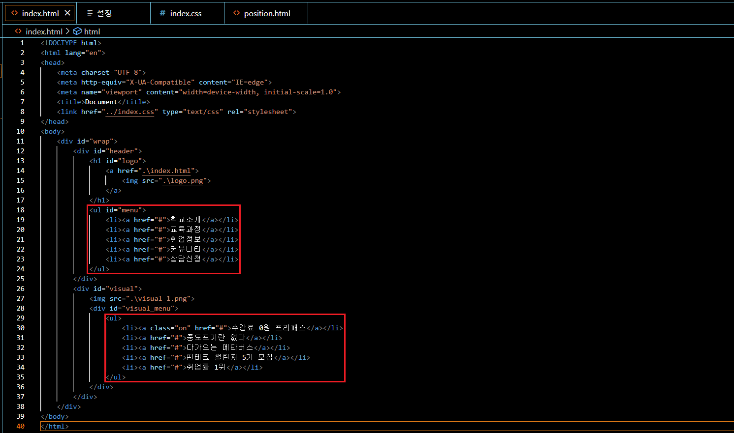 먼저 <ul>,<li>태그를 사용해 웹페이지 상단바와 배너에 나타내고 싶은 문구를 입력한다. 메뉴와 배너 메뉴를 클릭할 때 넘어가는 페이지는 아직 제작되지 않았기 때문에 href="" 안에 임의로 #을 입력했다. 배너 문구 중 '수강료 0원 프리패스' 부분의 <a> 태그에 class="on"을 삽입한 이유는 검정색 음영 처리를 해주기 위해서이다. 이는 추후 실습에서 애니메이션 효과를 주어서 '수강료 0원 프리패스' ~ '취업률 1위'가 순차적으로 음영이 나타나게 될 예정이다.