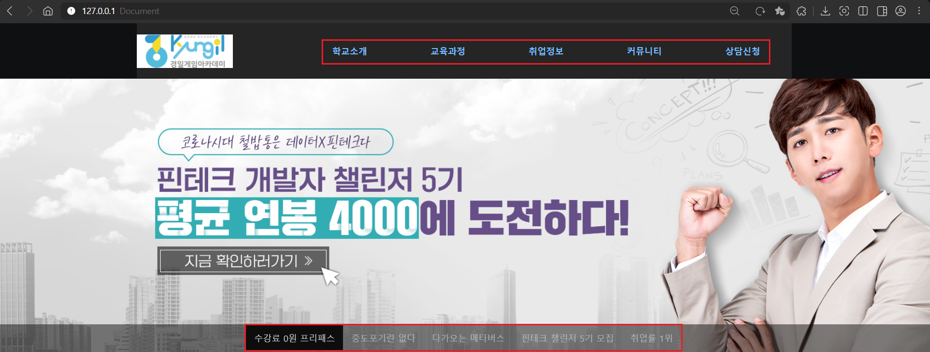 학원 웹사이트와 같은 색상, 배치 등이 구현되었다.