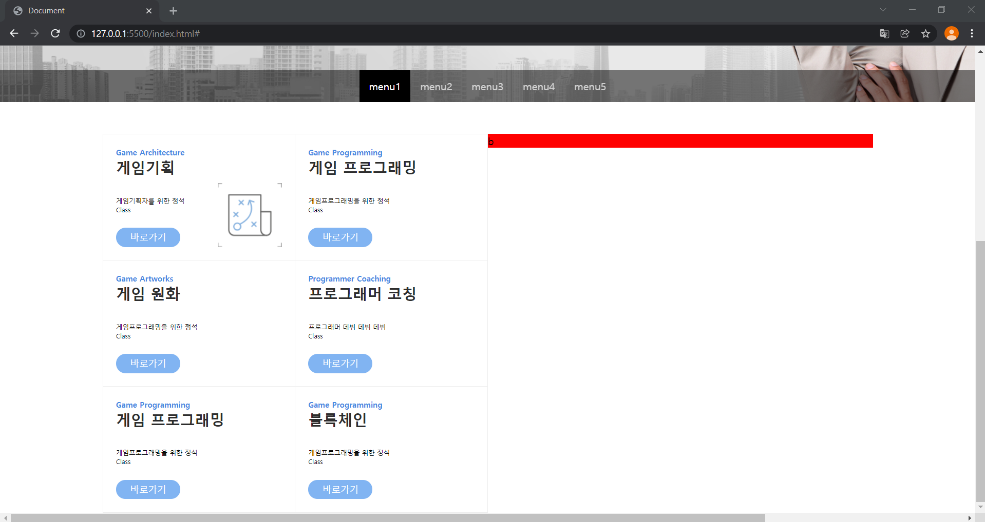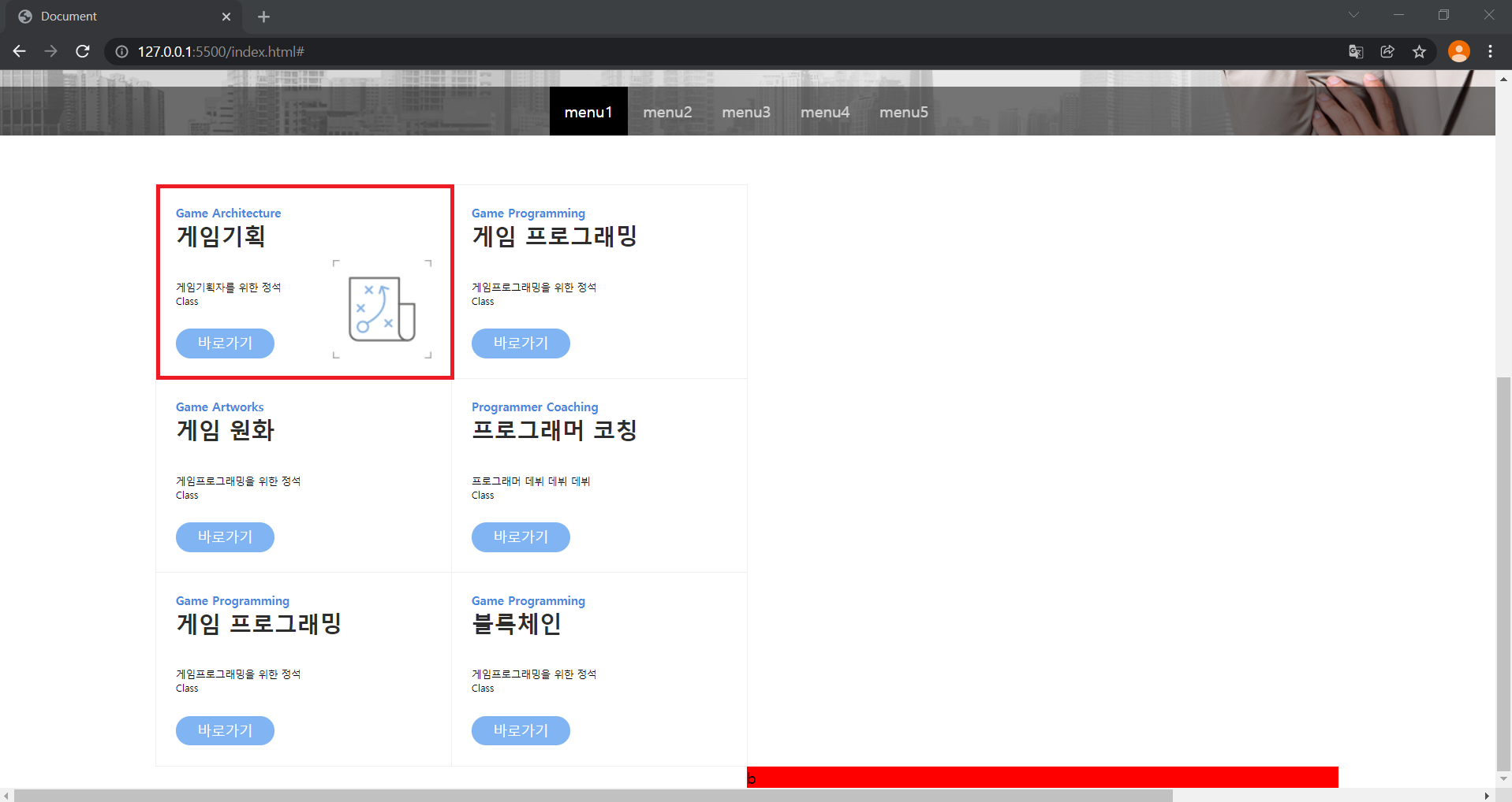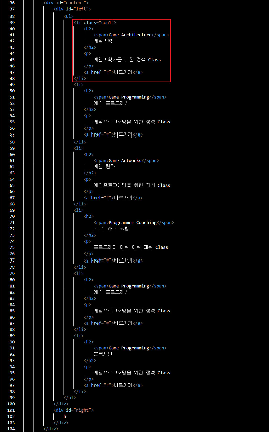 id가 content인 div 태그를 생성하고 그 안에 id가 left, right인 div 태그를 만들어주었다. 개발은 나 혼자 하는 것이 아니기 때문에 id명은 직관적으로 쉽게 추측할 수 있는 것으로 하는 것이 나를 위해서도, 남을 위해서도 좋다. 따라서 left, right 같은 id 명을 쓰는 것보다 content의 왼쪽이나 오른쪽 부분에 넣을 내용으로 명시해주는 것이 바람직하다. [그림 1]을 보면 <li></li>태그가 6개 포함되어 있으므로, id=left에는 content가 con1을 포함하여 6개가 들어간다는 것을 알 수 있다. <h2></h2> 태그를 이용해 원하는 글자크기를 갖는 'Game Architecture, 게임기획' 이라는 문구를 넣었다. <p></p> 태그는 하나의 문단을 나타내고, 문단에 들어갈 내용을 '게임기획자를 위한 정석 Class'로 해주었다. 그 밑에 <a></a>태그를 이용해 '바로가기'를 클릭하면 다른 링크로 이동할 수 있도록 구성했다. 강조된 부분의 내용을 복사+붙여넣기 하여 나머지 5개의 content도 만들어 보았다.