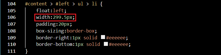 문제를 해결하기 위해, left에 box-sizing:border-box;를 추가해 준 부분은 그대로 두고, li 부분에 width를 300픽셀에서 299.5픽셀로 변환했다. 각 콘텐츠의 width를 299.5픽셀로 바꿔주면 600픽셀의 공간 안에 border-left와 2개의 콘텐츠를 모두 넣을 수 있기 때문이다. 즉, left의 600픽셀의 공간이 ( border-left 1픽셀 + '게임기획' 콘텐츠 299.5픽셀 + '게임 프로그래밍' 299.5픽셀 = 600픽셀 ) 이 된다. [그림 6]의 border-right과 border-bottom이 차지하는 픽셀들은 box-sizing:border-box; 가 적용되어 있기 때문에 고려하지 않아도 된다. (border-right과 border-bottom의 1픽셀은 각각 콘텐츠의 너비인 299.5픽셀 안에 포함된다.)