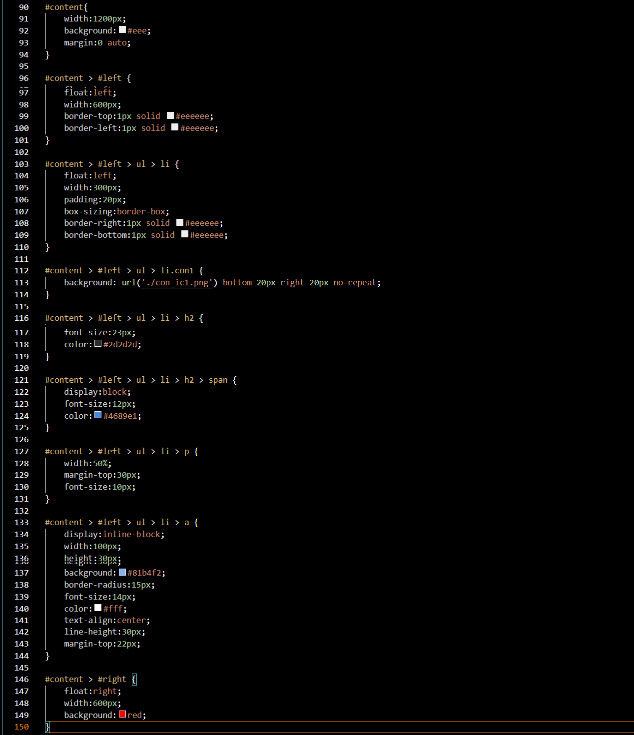 content의 전체 영역 너비는 1,200픽셀로 설정하고, margin:0 auto;로 가운데 정렬했다. id가 left, right인 곳의 너비는 각각 600픽셀로 나누었다. left의 border-top과 border-left는 1픽셀의 실선으로 설정했는데, 굳이 border 하나만 써서 사방의 경계선을 만들어주지 않은 이유는, left 안에 있는 6개의 콘텐츠들이 만나는 경계에 2개의 실선이 그려져서 이 부분만 더 두껍게 나타나 미관상 좋지 않기 때문이다.