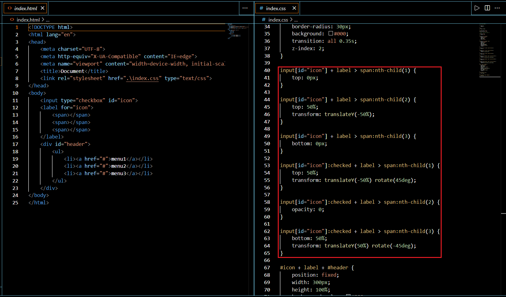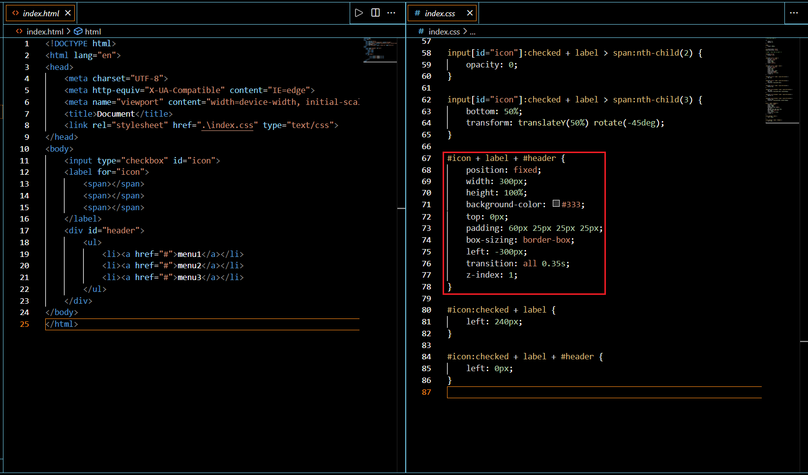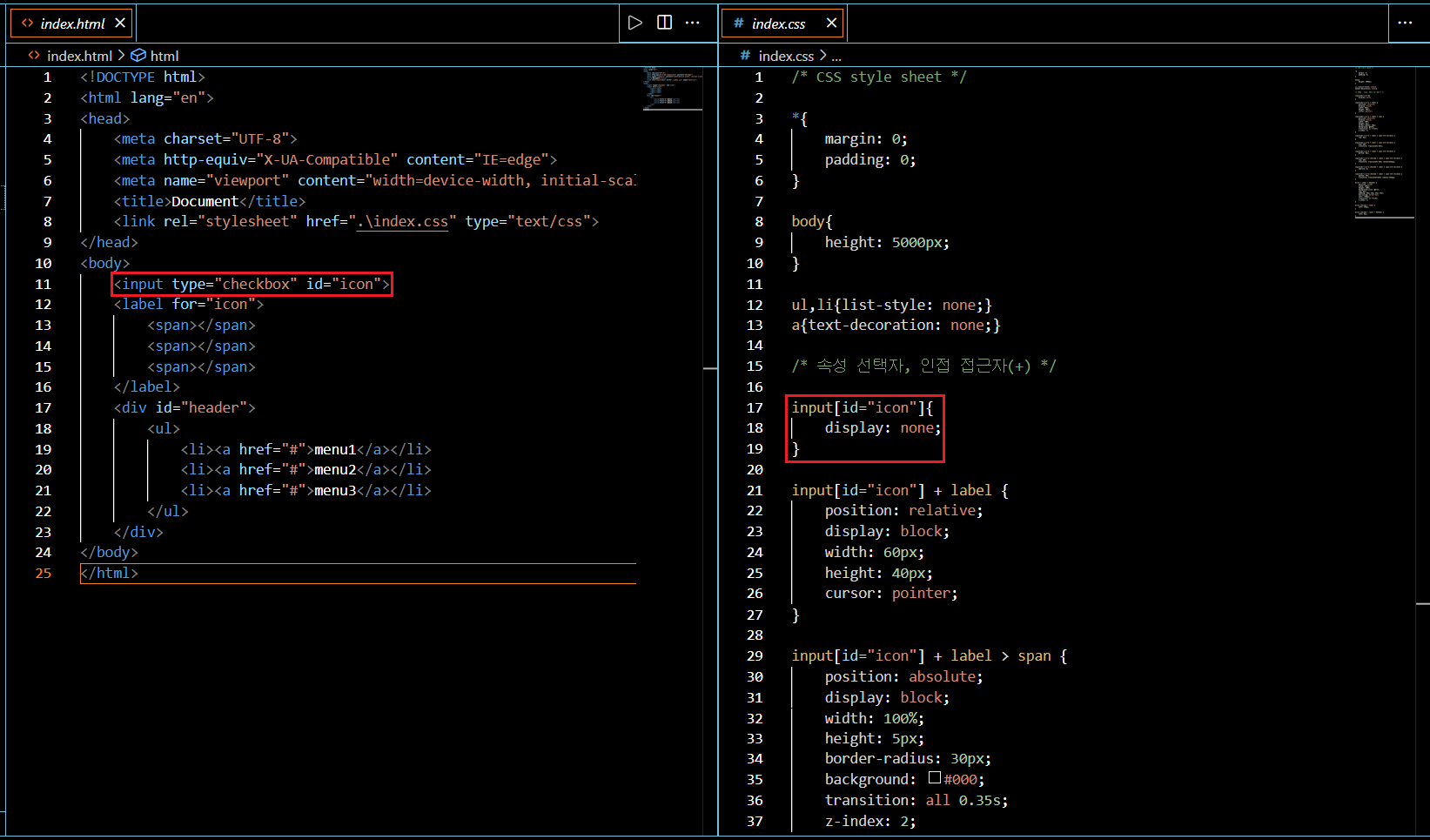 [그림 2]의 index.html을 보면 body 영역의 <input>, <label>, <div id="header"> 태그는 서로 인접해 있다. 만약 인접 선택자가 없었다면, 3개의 태그에 동일한 속성을 지정해주고 싶을 때 각각의 태그에 같은 속성을 3번을 반복해서 작성해야 하는 번거로움이 있을 것이다. 하지만 인접 선택자를 사용하면, 같은 속성을 지정해 주고 싶은 여러 부분을 한 번에 해결할 수 있어서 효율적이다.